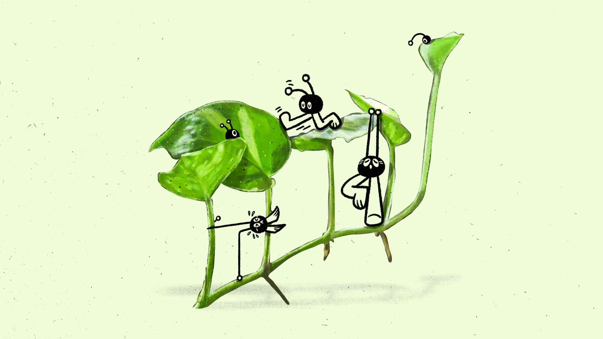 In a whimsical micro-world hidden among vibrant leaves and sprawling plants, a charming folivore family transforms everyday greenery into extraordinary playthings.